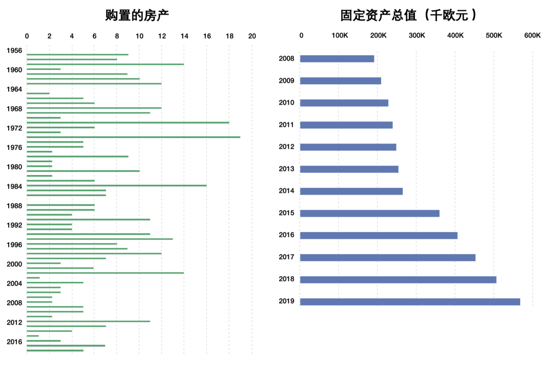 图一、柱状图显示1956–2016年Stadsherstel收购的房产数量(左)及固定资产增长趋势(右)(单位:千欧元)(译者注)