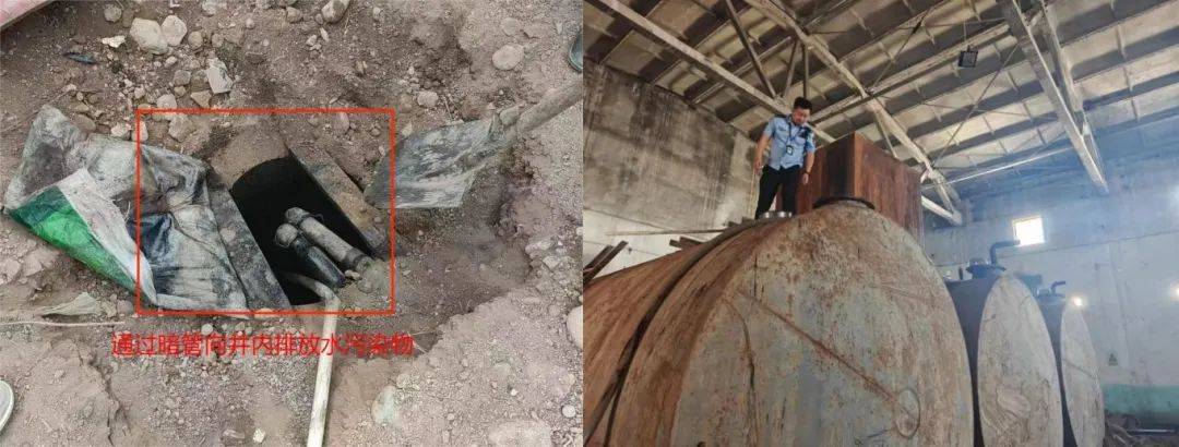 2024年4月21日,新乡市生态环境局卫辉分局接群众举报,反映卫辉市顿坊店乡某村水井灌溉用水呈黑色,疑似被附近一无名化工作坊污染,立即指派执法人员调查核实。执法人员到达现场发现,该化工作坊人员已撤离,相关生产设施和管路已被破坏,厂房外南侧有一口水井,井内水体呈黑色,井口处有两根地埋暗管通向厂区方向,经联系挖掘机沿暗管掘进搜索,在水井附近挖掘出两个容积约为30m³的储罐。综合现场情况,初步判断该无名化工作坊涉嫌利用暗管向水井内偷排污染废水,立即通知公安机关到场联合开展调查。