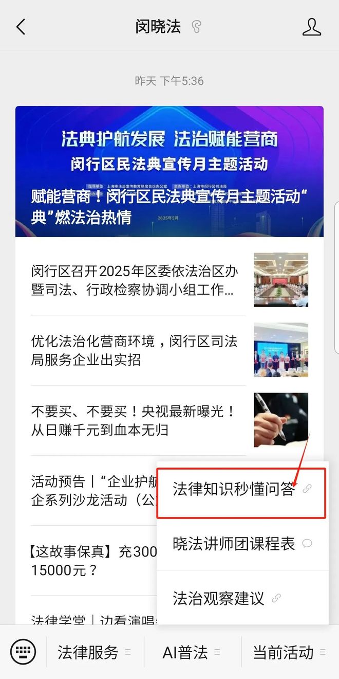 关注“闵晓法”微信公众号,在手机下方子菜单“当前活动”中找到“法律知识秒懂问答”进入答题页面即可答题。